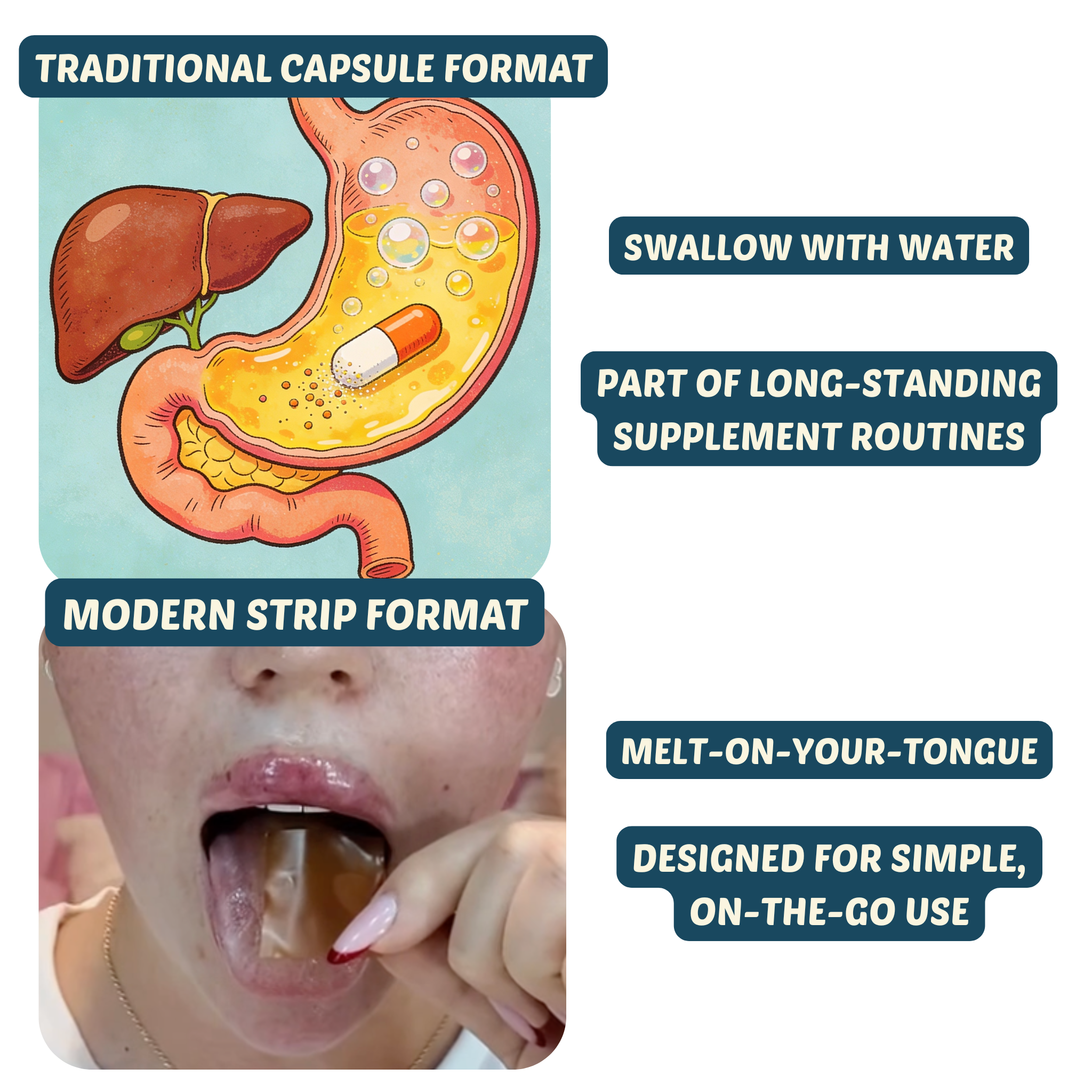 Designed as a sleek, melt-on-your-tongue alternative to traditional supplement formats, built for ease and consistency.