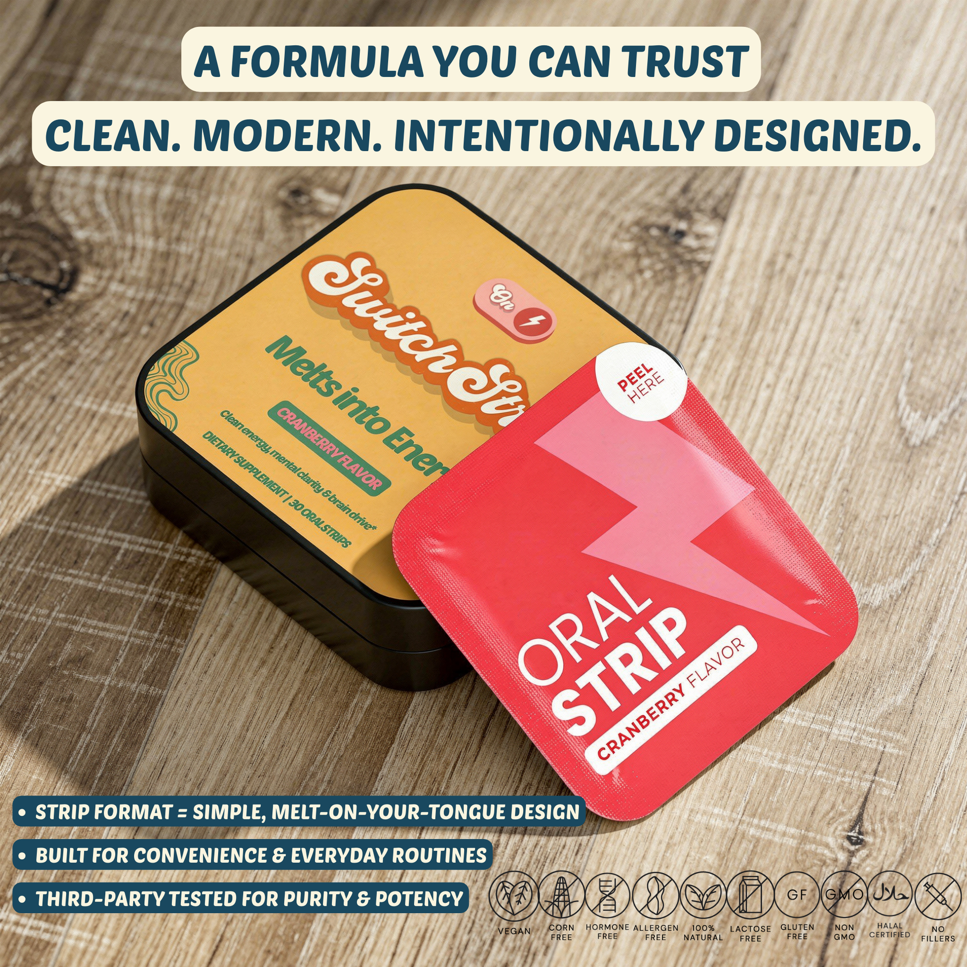 Melts Into Energy™ is a cranberry-flavored oral strip designed for people who want a modern, convenient way to support everyday energy as part of their routine. It’s built for real life — early workouts, long workdays, travel, and busy schedules where simplicity matters.